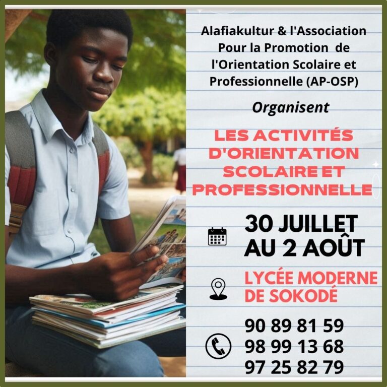 Alafiakultur et AP-OSP lancent un appel à tous les élèves de Sokodé et des environs pour qu’ils participent massivement à ces quatre jours d’orientation scolaire et professionnelle au Lycée moderne de Sokodé.
