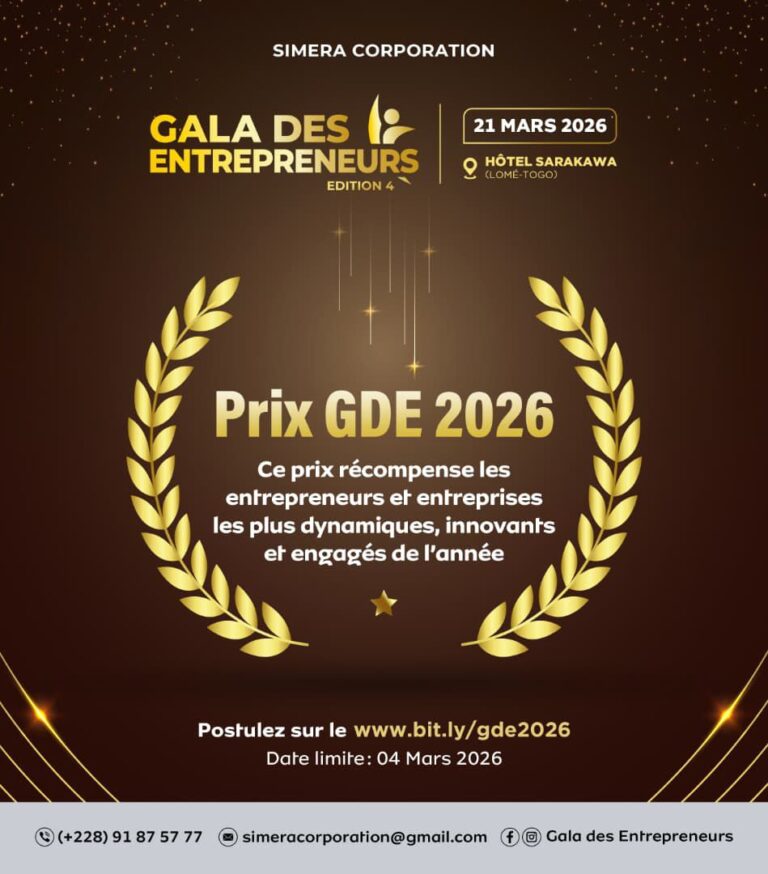 La remise officielle des distinctions se tiendra lors de la soirée Gala des Entrepreneurs – édition 4, prévue le samedi 21 mars 2026 à 20 heures, à l’Hôtel Sarakawa à Lomé. Cet événement réunira acteurs économiques, décideurs publics et partenaires autour d’un moment de célébration de l’excellence et du mérite entrepreneurial. Les entreprises intéressées sont invitées à soumettre leur candidature dès maintenant via la plateforme dédiée : www.bit.ly/gde2026. La date limite est le 4 mars 2026 et pour plus d’informations, contacter le (+228) 91 87 57 77.